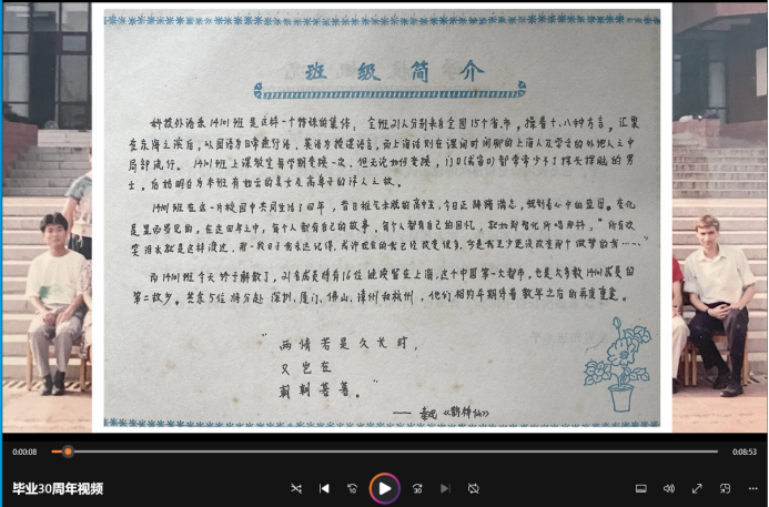胡涛校友为此次三十周年返校重聚特别制作了“SJTU14101毕业30周年聚会纪念”视频,图文并茂地向各位学院老师展示了当年班级每位同学的模样及个人简介,配以诙谐幽默的语言细数过往相聚并介绍了校友们如今的各自发展及家庭情况。视频一经播放,就引起满堂喝彩,将仪式的氛围推至高潮。